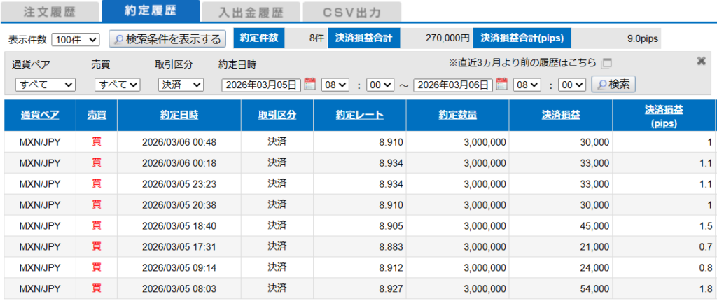 HOME日次 2025-03-05 MXN/JP +9pips 2026年3月6日 日次 決済損益 270,000円,スワップ 81,600 となります。 2025-03-04 MXN/JP +13pips 2025-03-06 MXN/JP +0.9pips