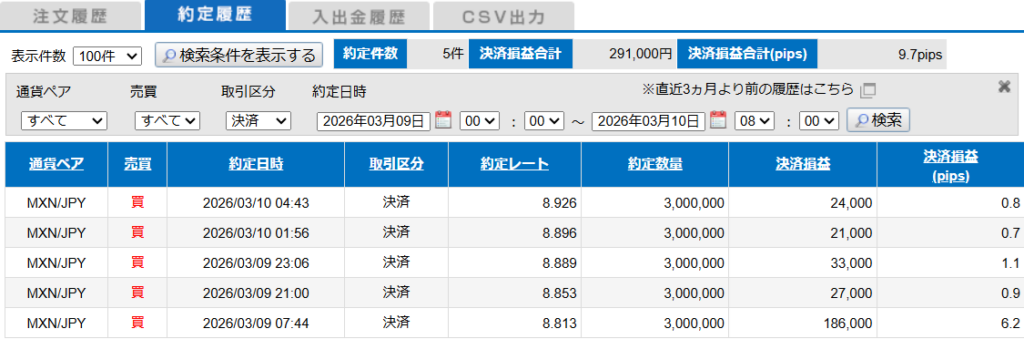 HOME日次 2025-03-09 MXN/JP +9.7pips 2026年3月10日 日次 決済損益 291,000円,スワップ 37,160 となります。 04:30頃にトランプさんからの戦争終結へ向けての重大発表があり、WTIが大幅下落して、MXN/JPも大幅に上がりました。 2025-03-W1 MXN/JP +49.9pips 2025-03-10 MXN/JP +10.8pips