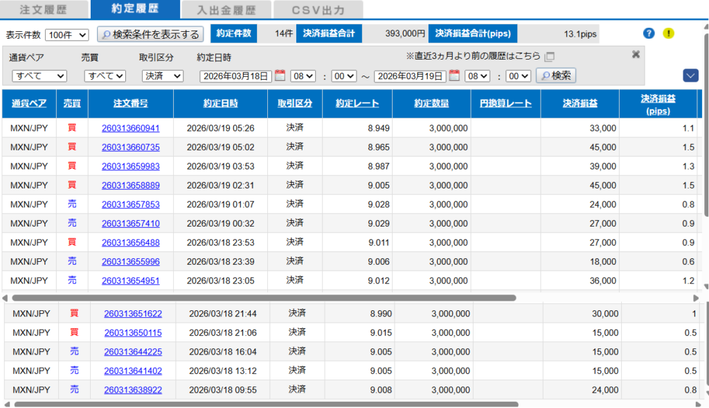 HOME日次 2025-03-18 MXN/JP +13.1pips 2026年3月21日 日次 決済損益 393,000円,スワップ -8,800 となります。 9.0あたりで、両建てして、売り買いを繰り返しました^^ 2025-03-17 MXN/JP +8.7pips 2025-03-19 MXN/JP +6.9pips