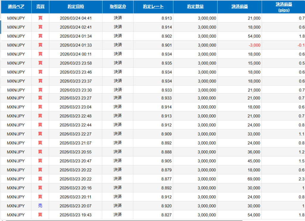 HOME日次 2025-03-23 MXN/JP +20.9pips 2026年3月27日 日次 決済損益 627,000円,スワップ 412,50となります。 19:00頃のトランプさんの発言で、かなり大きなボラが発生してうまく決済して履歴が取れました^^30分で30万程^^ 2025-03-W3 MXN/JP +41.8pips 2025-03-24 MXN/JP +11.9pips