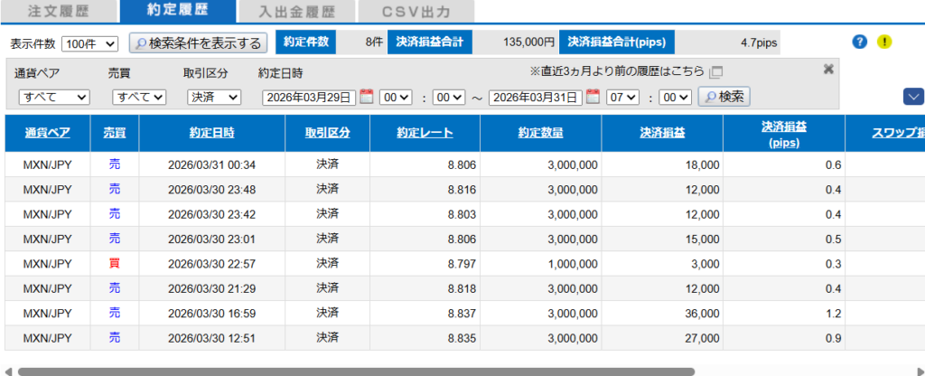 HOME日次 2025-03-30 MXN/JP +4.7pips 2026年4月5日 日次 決済損益 135,000円,スワップ 46,200となります。 2025-03-W4 MXN/JP +58.3pips 2025-03-31 MXN/JP +1.4pips