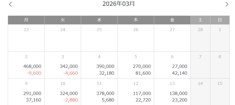 HOME週次 2025-03-W2 MXN/JP +41.6pips 2026年3月18日 週次 MXN/JPN 03-09~03-13 は決済損益 1,248,000,スワップ 85,800 となります。 2025-03-13 MXN/JP +4.6pips 2025-03-16 MXN/JP +3.7pips