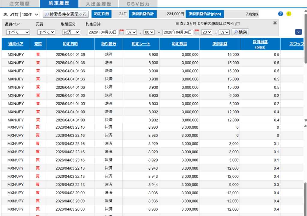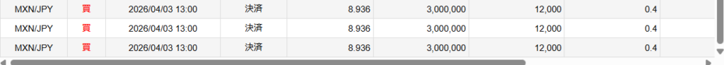 HOME日次 2025-04-03 MXN/JP +32pips 2026年4月6日 日次 決済損益 234,000円,スワップ 0となります。本日はイースター休暇の影響で相場は動かず。ただし、4日の深夜にかなりのボラが発生し良いところでショートのエントリーができました。決済のタイミングでスフレッドがかなり大きくなり、決済を断念しました。 2025-04-02 MXN/JP +32pips 2025-04-W1 MXN/JP +69.1pips