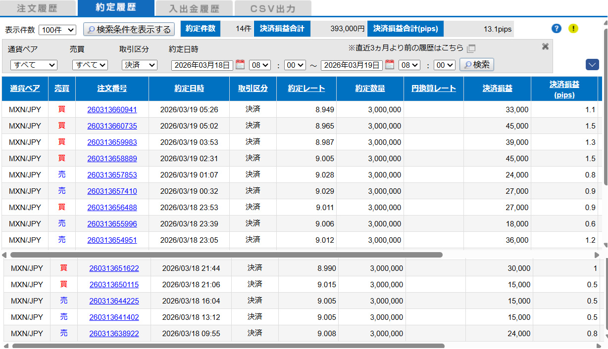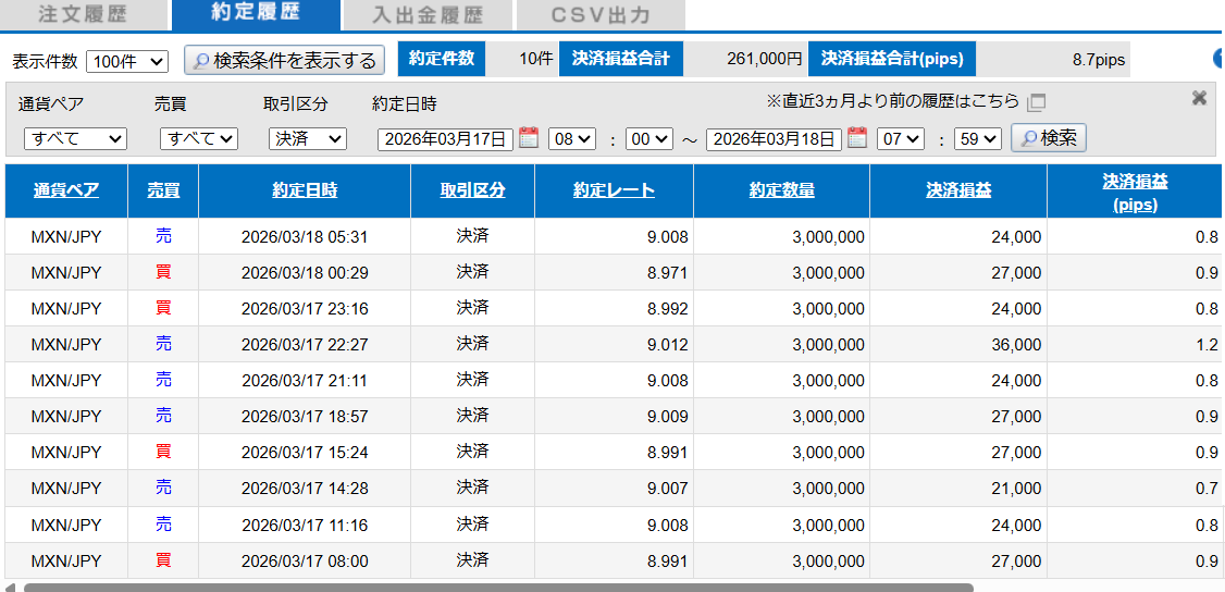 MXN/JPN 03-09~03-13 は決済損益 1,248,000,スワップ 85,800 となります。